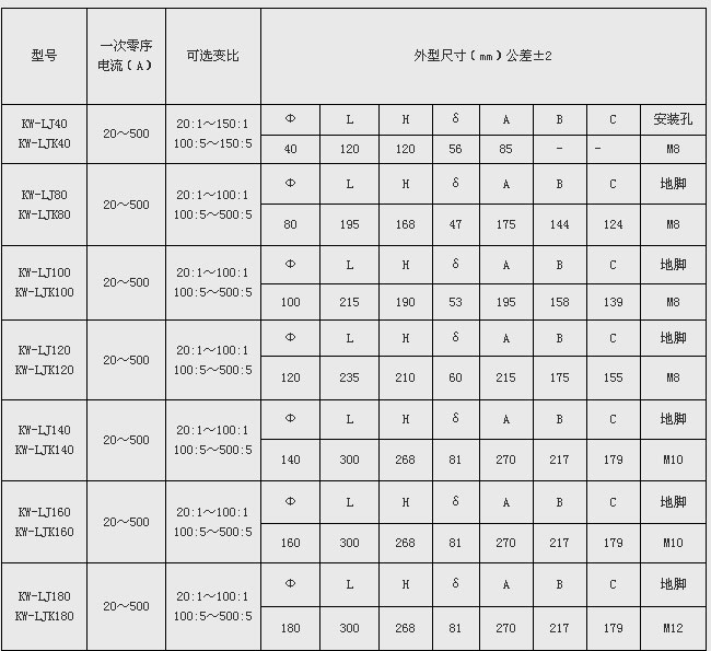 備注:可根據(jù)用戶需求定制φ40,φ260,φ300,φ350等口徑的零序電流互感器。