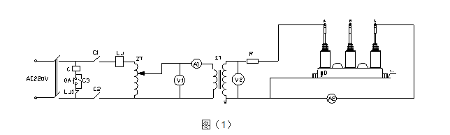 ? ? ? ?V1、V2-電壓表 ?A1、A2-數(shù)字電流表 ?ZT-調(diào)壓器 ?ST-試驗變壓器 ?LJ-電流繼電器 ?R-限流電阻